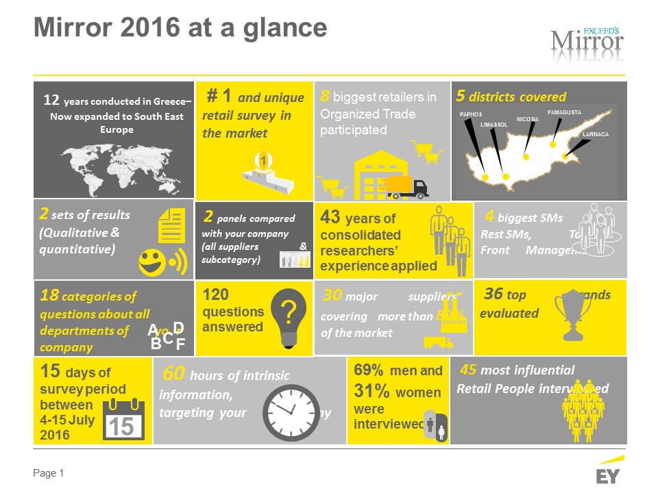Η Έρευνα Εμπορικής Γνώμης των αλυσίδων Υπεραγορών για τους μεγάλους Προμηθευτές τους αποτελεί μέρος της μεγάλης οικογένειας ερευνών «Exceed’s Mirror», που στόχο έχουν να αξιολογήσουν τις σχέσεις μεταξύ των μεγάλων αλυσίδων και των κυριότερων προμηθευτών τους, παρέχοντας απαντήσεις σε κρίσιμα ερωτήματα και προτείνοντας τρόπους βελτιστοποίησης των σχέσεων αυτών. Σε αυτό το πλαίσιο, η ΕΥ σε συνεργασία και πάλι με την Exceed Consulting, έχει σχεδόν ολοκληρώσει το δεύτερο κύμα του κύκλου της Mirror 2016 στην Κύπρο, αυτή τη φορά διερευνώντας τις σχέσεις από την αντίστροφη όψη, το πώς δηλαδή οι προμηθευτές αξιολογούν τις μεγάλες αλυσίδες υπεραγορών.